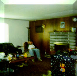 Autumn's house, as viewed underwater. Or when a little kid decides to wave the polariod around before it's done developing. That's Travis in the chair. . . . . .